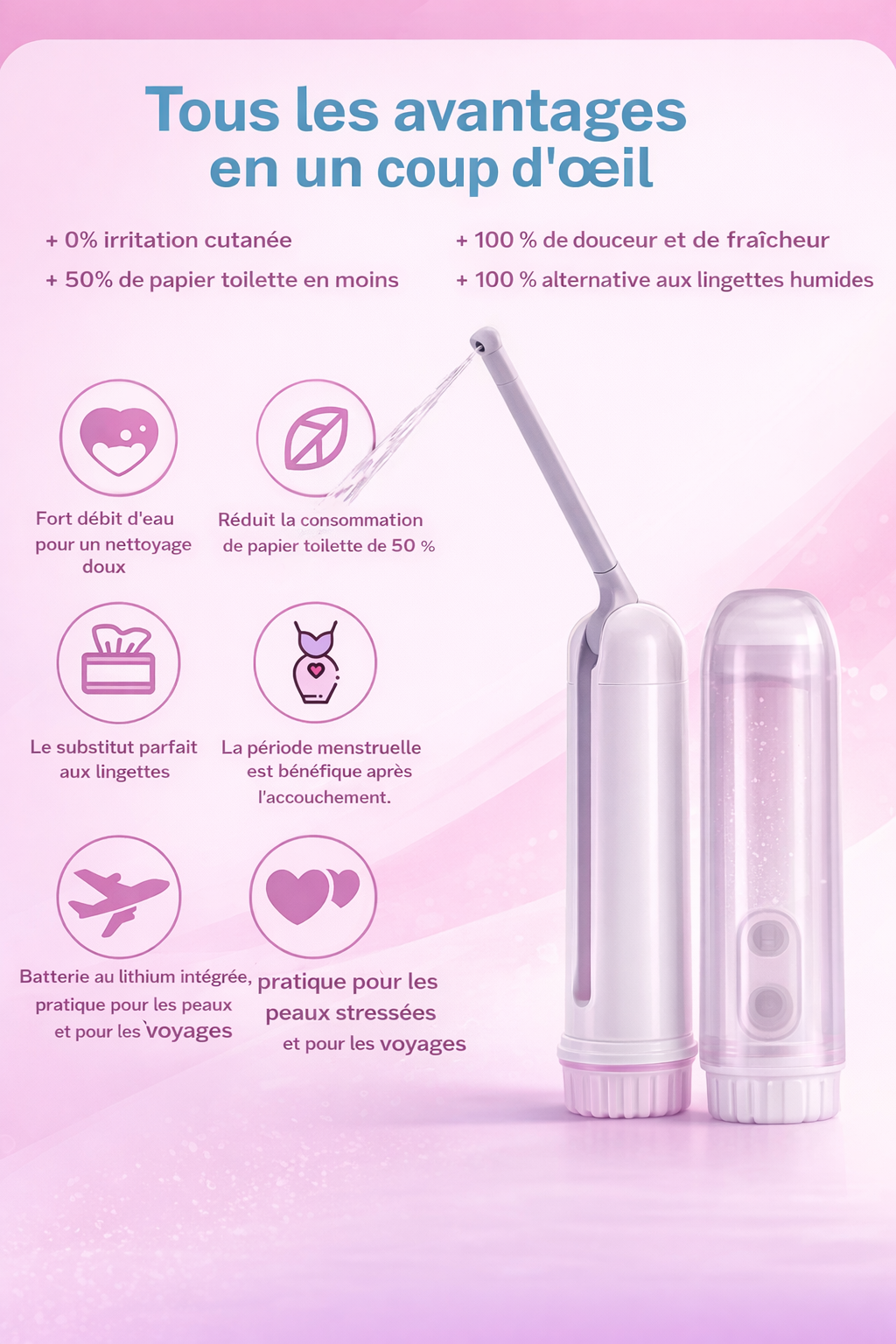 Ce bidet électrique est ultra-compact, se glisse facilement dans n'importe quel sac, il s’adapte à toutes les situations et positions, grâce à son inclinaison réglable, offrant une utilisation optimale partout, que ce soit à la maison ou en déplacement.